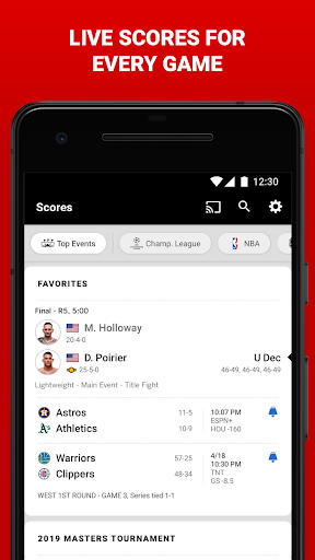 - Fast access to scores for your favorite teams and leagues and the top games of the day
